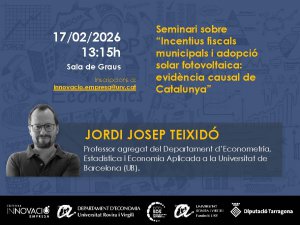 El dia 17 de febrer a les 13:15 CEST en format presencial i també per Teams, Jordi Josep Teixidó (UB) presentarà el seu document de treball "Incentius fiscals municipals i adopció solar fotovoltaica: evidència causal de Catalunya"